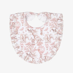 Cute ivory bib for baby girls by My Little Pie, made in soft organic Supima cotton jersey. This accessory is patterned with fun pink llamas, heart balloons and clouds. It has a sweet ruffled trim and an easy popper fastening on the back of the neck.