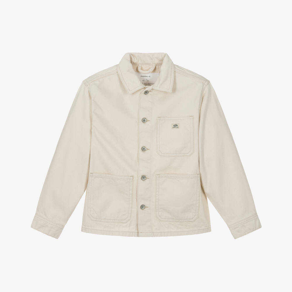 Ivory denim jacket for older boys, by Danish brand NAME IT. Made from non-stretch cotton, this timeless piece has a collar and branded metal buttons for a classic look. It has patch pockets on the front and a small branded label stitched on the chest.