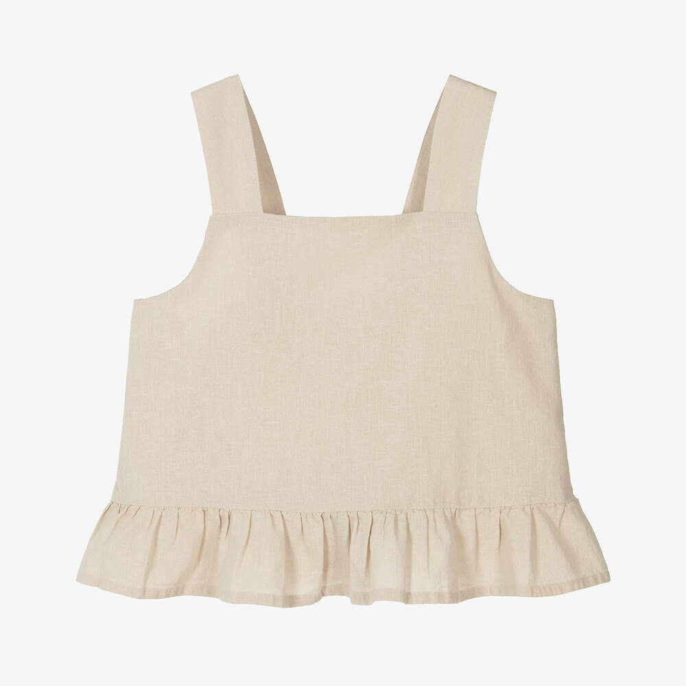 Lovely beige top for girls by NAME IT, woven in a breathable cotton and linen blend. Ideal for warmer days, this sleeveless style sits nicely on the waist and has a pretty ruffle hem.