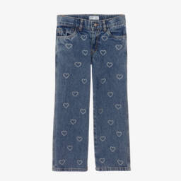 Mid blue denim jeans for girls by NAME IT, made with organic cotton. These high-waisted jeans are baggy on the hips and softly tapered through the legs. They have five-pocket detailing and an adjustable waistband for a good fit. Smiling hearts, embroidered in pink and red tones, add a playful touch.