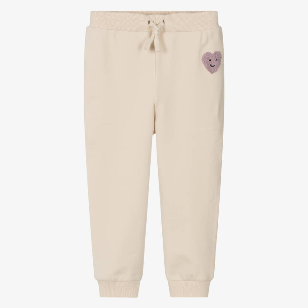 Casual jersey joggers for girls from NAME IT, in a warm shade of ivory. They have lightly ribbed trims and an adjustable waistband for a good fit. A purple towelling heart is stitched on the front, designed with a cute smiling face.
