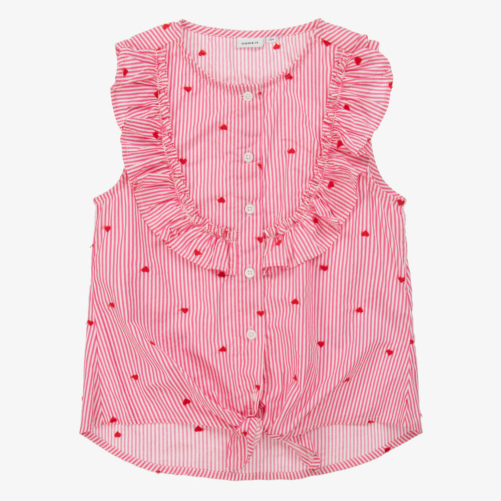 Girls pink striped blouse by NAME IT, softly woven in lightweight organic cotton. Embroidered with ditsy red hearts, this sleeveless style has ruffles on the chest and a stylish tie on the hem. It fastens with buttons on the front.