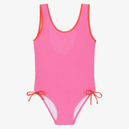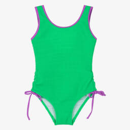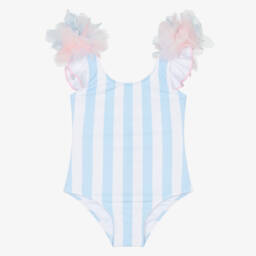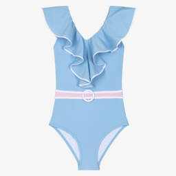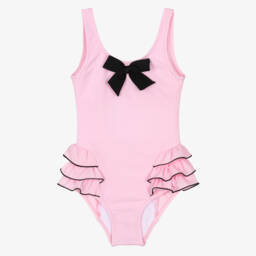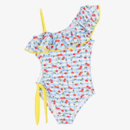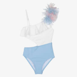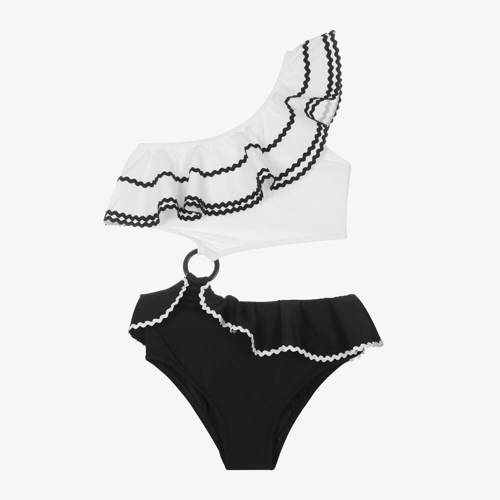 A black and white swimsuit for girls by Nessi Byrd, made in smooth and stretchy fabric with UV50. In an asymmetric one-shoulder design, it has a fabulous ruffle over one shoulder and a ring that attaches the top and bottom. With contrast ric rac trims adding a chic finish, this stylish piece is fully lined for comfort.