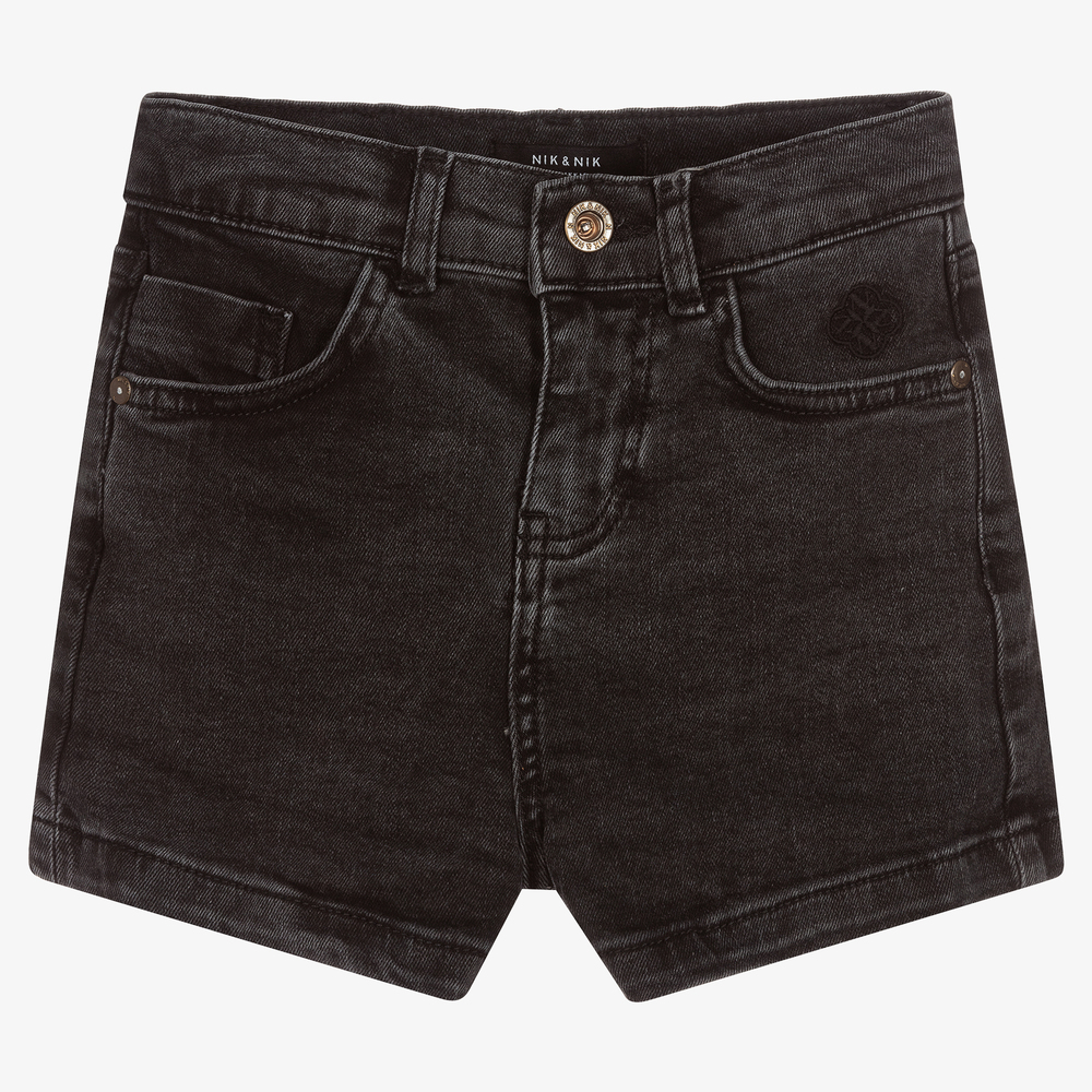 Teen girls black shorts by NIK&NIK, made in soft, stretchy cotton denim. They have a zip and button fastening on the front and classic five-pocket styling. There is a black brand logo embroidery on the front and a black leather logo patch around the back of the adjustable waistband.