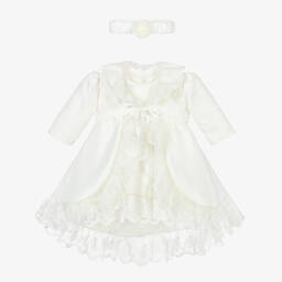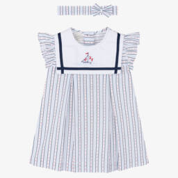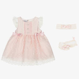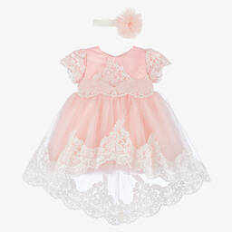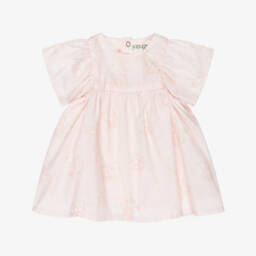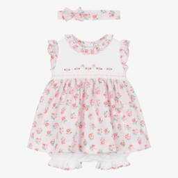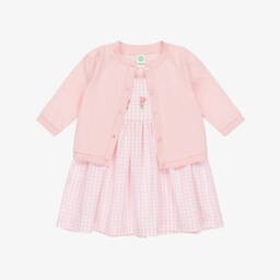 Pink dress and knickers set for baby girls by Nike, made in a soft polyester and viscose blend jersey. The dress has a large swoosh logo print on the front, in green and pink, with a matching-coloured slogan print on the back. The knickers are comfortably elasticated and have a small white logo print.