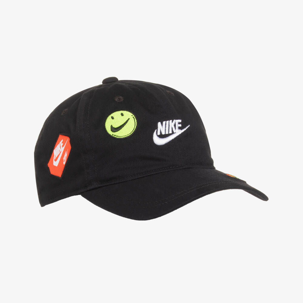 Black cap for boys and girls by Nike, with embroidered logos and designer-inspired patches for a cool look. Made in soft cotton twill, it has a stiff peak to protect the eyes and an adjustable strap on the back.
