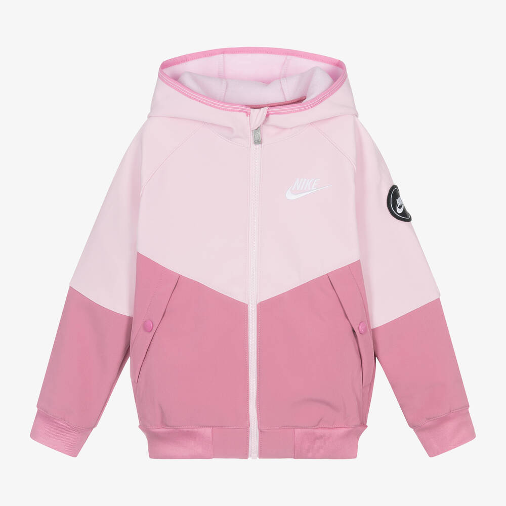 A pink colourblock softshell jacket for girls by Nike, with a cosy fleece lining. It has a signature Swoosh logo embroidered on the chest and an appliquéd logo patch on one sleeve. This soft and smooth jacket has a branded front zip fastening, hiding a 'Just do it' slogan beneath. There are stretchy ribbed cuffs for a snug fit, with popper-fastening pockets to finish.