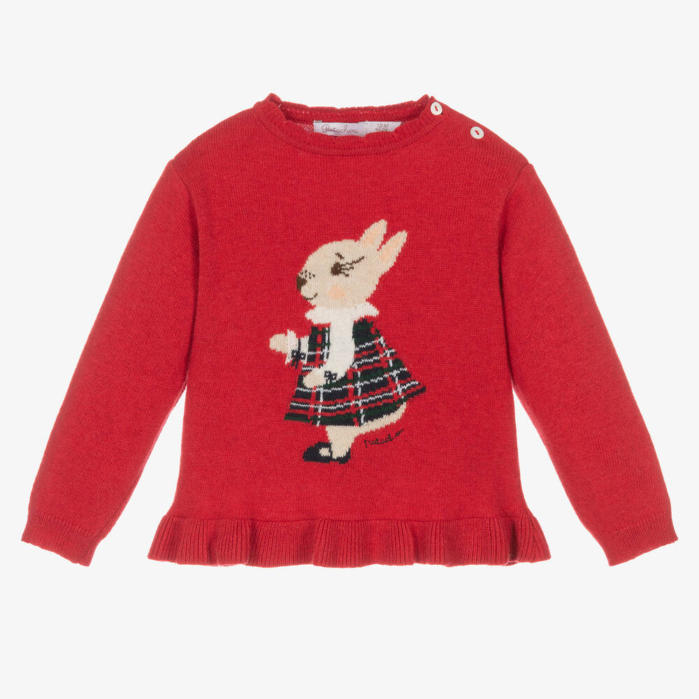 Girls red sweater by Patachou, with a cute bunny rabbit motif in the middle. Knitted in a luxurious blend of cashmere, Merino wool and viscose, it has a sweet scalloped neckline and ruffled hem, with small buttons to fasten on one shoulder.