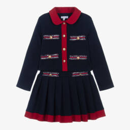 Charming white cotton skirt set for girls from Patachou, made in beautiful, lightweight seersucker fabric. The cropped top has a large collar trimmed with yellow, tassel detailing. The skirt is patterned with a beautiful Liberty floral print, with matching yellow trim for a coordinated look.