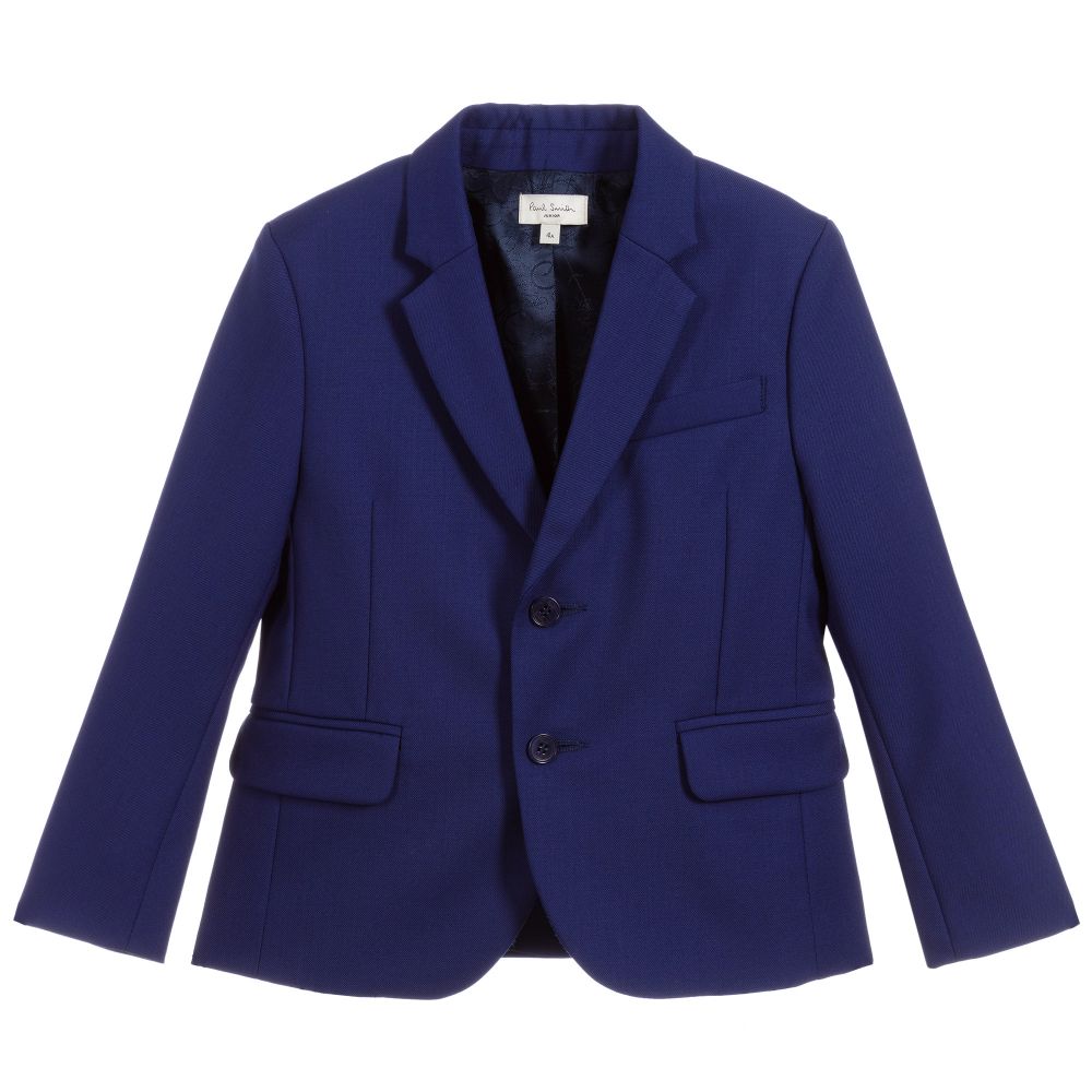 Royal blue Mini-me suit jacket for boys by Paul Smith Junior. Made in soft wool, it has a navy blue viscose lining, patterned in an all-over bicycle print. There are buttons to fasten, faux pockets on the front and a single vent on the back.