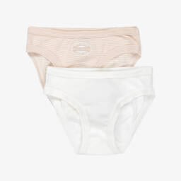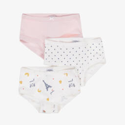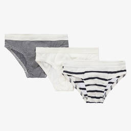 Pack of three frilly knickers for girls by Petit Bateau, made in soft organic cotton jersey. They come in blue, orange and ivory shades, one of which has a playful heart pattern. They are comfortably elasticated on the waist.