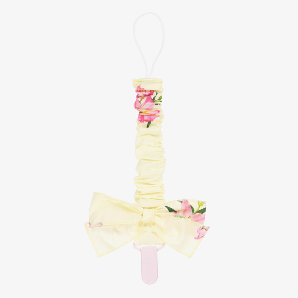 Adding a pretty yet practical finishing touch, this yellow dummy clip for baby girls is by Phi Clothing. Stretchy with a lovely pink floral print, it has a sweet bow and attaches with a clip. Easy to use, simply loop the dummy onto the white strap.