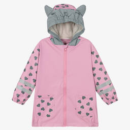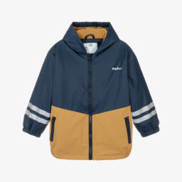 Boys blue hooded raincoat by Playshoes. Smooth and lightweight, it has a fixed mesh-lined hood and light reflective safety stripes. There are lightly taped seams to help protect little ones from showers. It has an orange digger print and elasticated cuffs to keep the cold out. It has two front pockets and fastens with a zip beneath the popper-fastening placket.