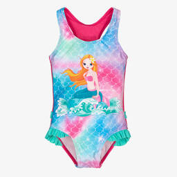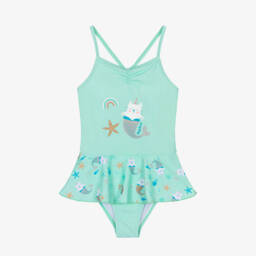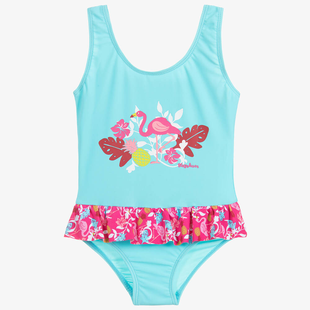 Girls turquoise blue swimsuit by Playshoes, with UPF 50+. It is made in silky and stretchy lycra, with a pink tropical flamingo print and a pineapple-patterned frill. It has a deep scooped back with a cross-over strap detail.
