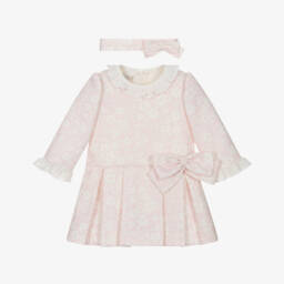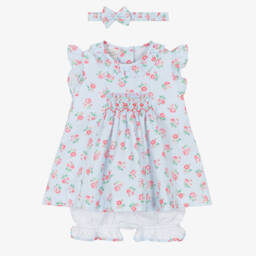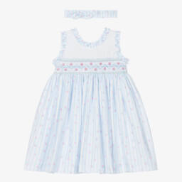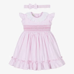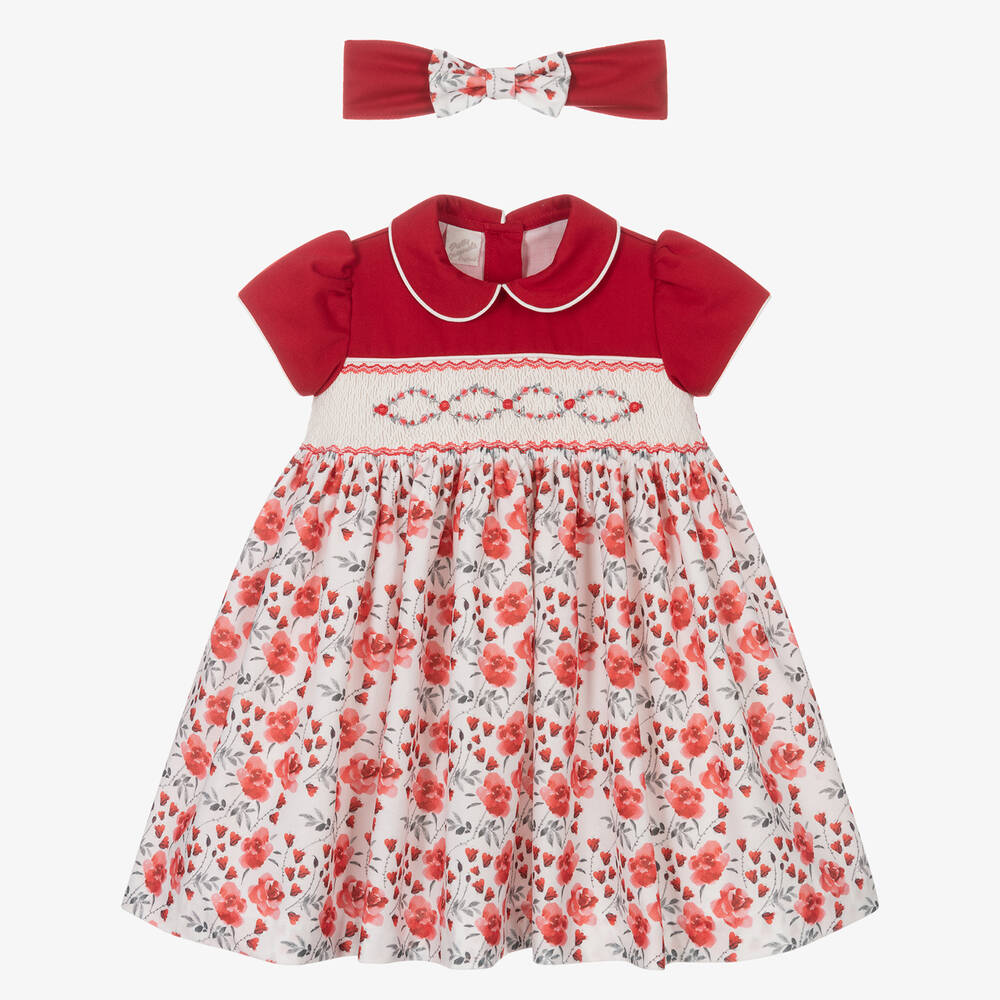 Lovely red floral dress set for little girls by British brand Pretty Originals. This soft and mid-weight traditionally styled dress has a beautifully hand-smocked panel across the bodice with pretty floral embroidery. It has a Peter Pan collar, sweet puffed sleeves and white trims. It fastens on the back with buttons and a sash that ties in a bow. The full gathered skirt has a stunning red floral pattern and is fully lined for comfort with soft lace-trimmed voile. To complete the look, it comes with a matching headband with a pretty bow on the front.