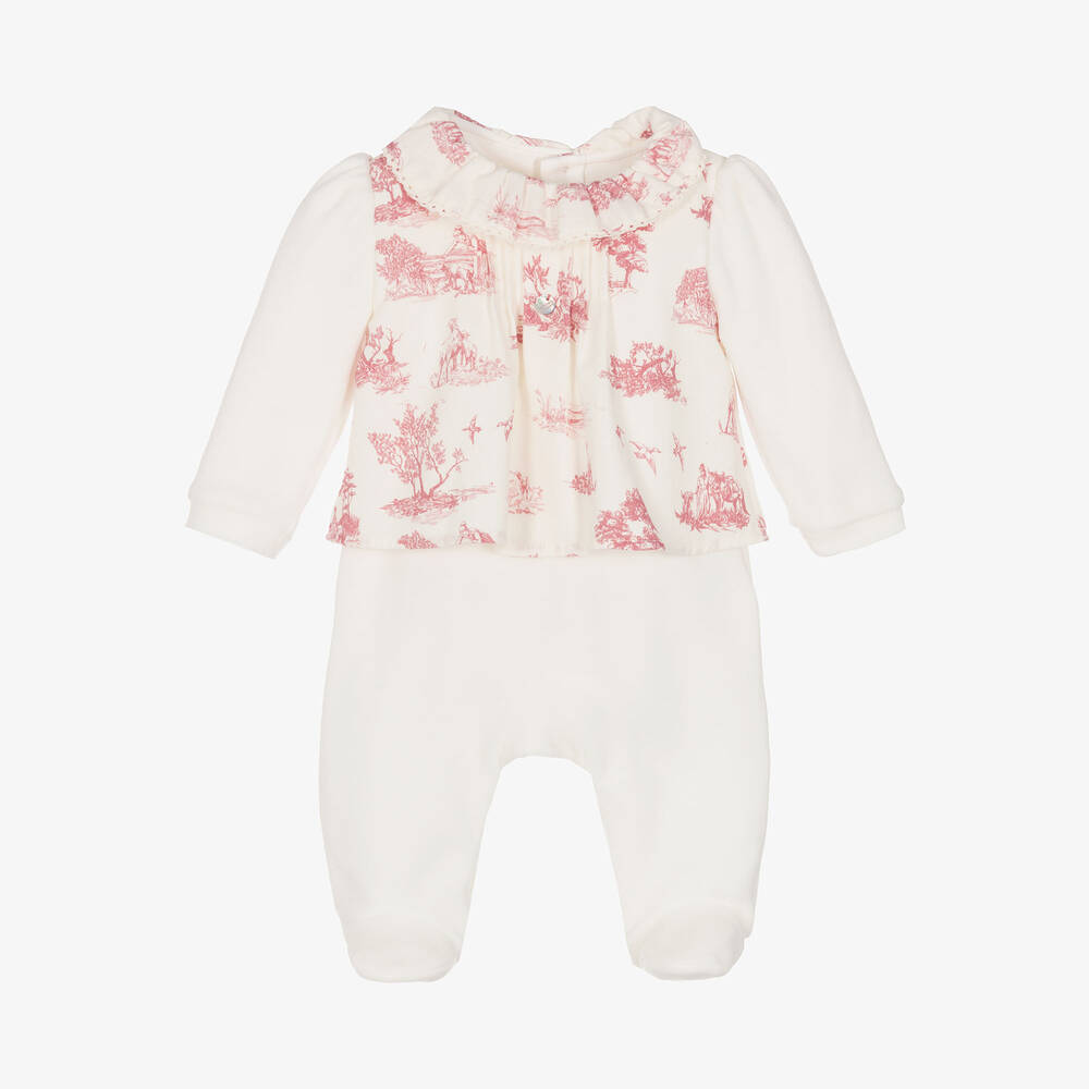 A charming ivory babygrow for girls by Pureté Du... Bébé, made in beautifully soft cotton velour. For a traditional look, it has a voile overlay patterned with a classic Toile de Jouy print in a lovely shade of pink. The matching ruffle collar has a delicate lace trim and, for a subtle designer touch, a mother-of-pearl logo charm can be seen on the front. For quick dressing, it fastens with poppers on the back and between the legs.
