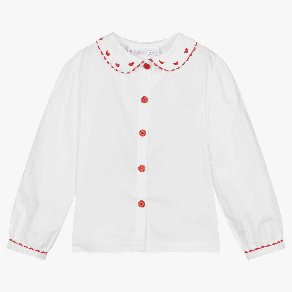 Lovely off-white cotton blouse for girls by British brand, Rachel Riley. The rounded collar and cuffs are trimmed with red scalloped detailing, and the collar has embroidered red hearts for a cute look. It fastens with matching red buttons on the front for a classic look.
