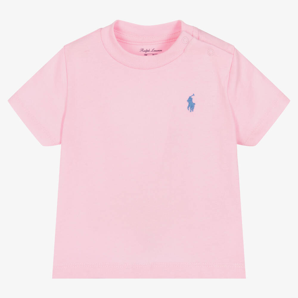 An adorable pale pink T-shirt for baby boys, by Ralph Lauren. This top is made in soft cotton jersey for comfortable, easy wear. It is charmingly finished with the iconic pony logo embroidered in dusky blue on the chest.