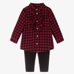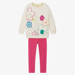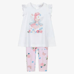 Baby girls cute and casual ivory leggings set by Ralph Lauren, made in soft, comfortable jersey. The T-shirt has instant designer appeal with a large blue logo printed across the chest, that has floral lettering layered and embroidered on top. Poppers on one shoulder make dressing easy and the frilled hemline gives a sweet silhouette. The easy-to-wear, full-length leggings have a colourful, vintage floral pattern.