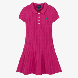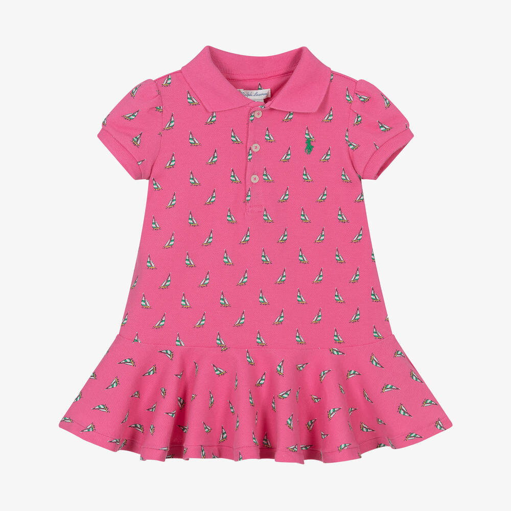Bright pink polo dress for girls by Ralph Lauren, made in soft cotton piqué. Classically styled with a ribbed collar and front button fastenings, it is patterned all over with little sailing boats and has the brand's signature polo pony embroidered on the chest in green. It has a ruffle hem and comes with matching knickers to complete the look