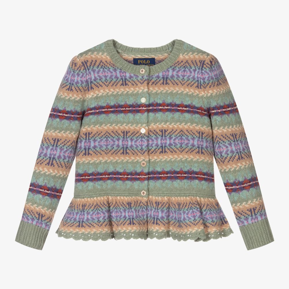 Gorgeous green Fair Isle cardigan for girls by Polo Ralph Lauren, knitted in a soft wool blend. It has beautiful patterned stripes in muted shades of purple, blue, pink and beige. There is a peplum hem with pretty scalloped trim and the cardigan fastens with mismatched buttons for added character.