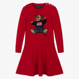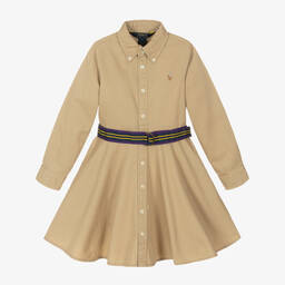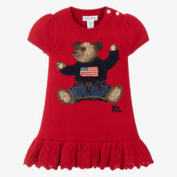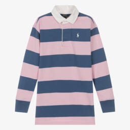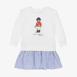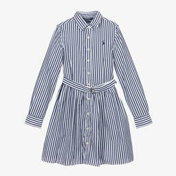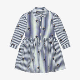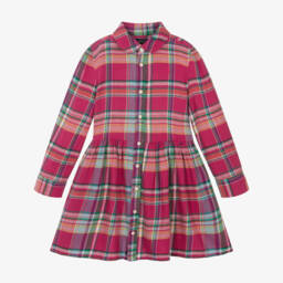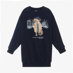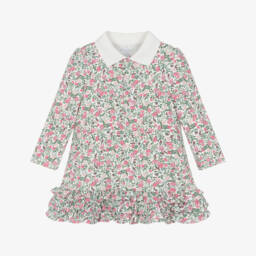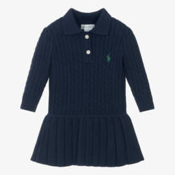 Navy blue cotton turtleneck dress for girls by American brand Ralph Lauren. The jersey bodice has pretty, curly-edged trims and the label's signature embroidered pony logo on one side. The poplin skirt has a pink and green floral print and a ruffled hem. Easy to wear, the dress simply pulls on.