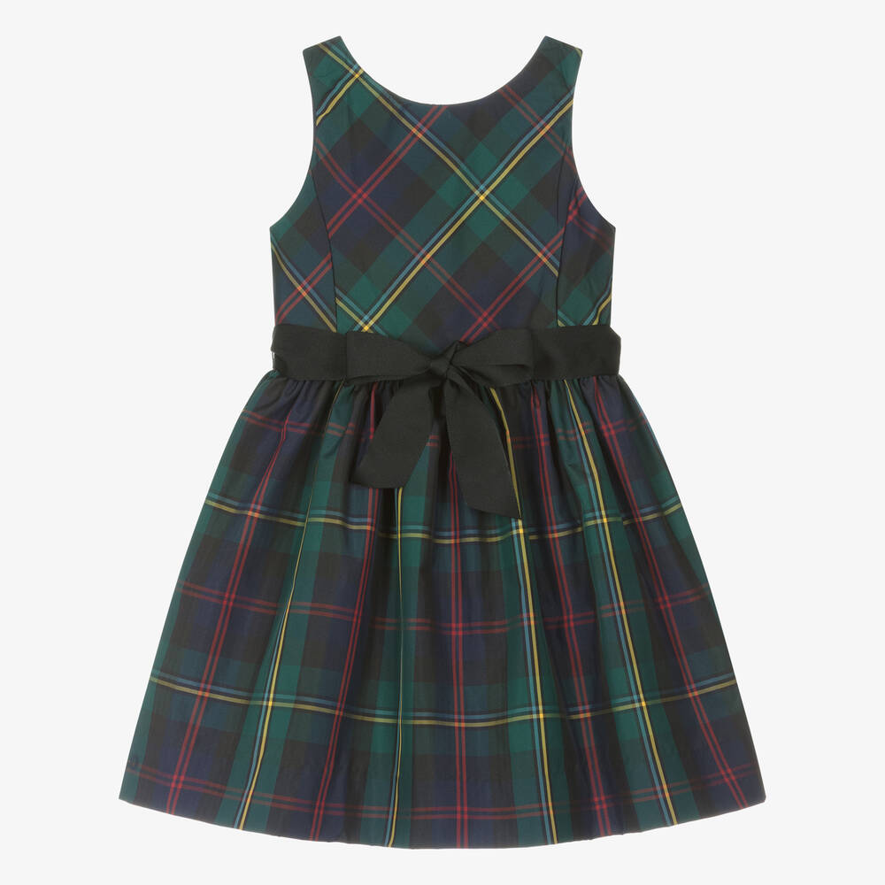A classic green and blue tartan dress for girls by Ralph Lauren. So smart and elegant, this special occasion dress is made in crisp taffeta with a beautiful luminescent sheen. The silky lining is trimmed with a ruffle and layer of tulle around the hem, adding volume to the skirt. This sleeveless fit-and-flare design has a detachable black grosgrain sash tie, with neat fabric-covered button fastenings on the back.