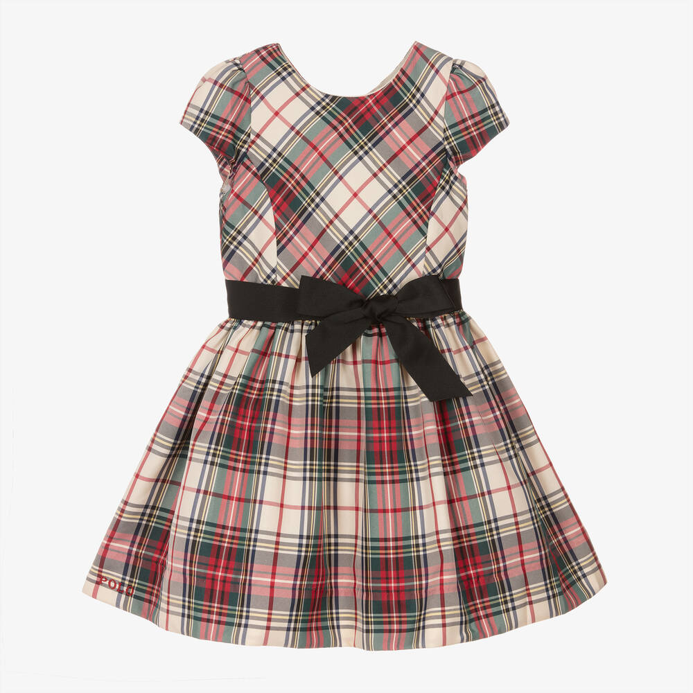 Traditional red tartan dress for girls by Ralph Lauren, made in soft satin twill. Capped sleeves add a cute touch to the simple bodice, which flows beautifully into the gathered skirt. Fabric-covered buttons on the back elegantly fasten the dress, and a satin sash belt around the waist complements the silhouette.