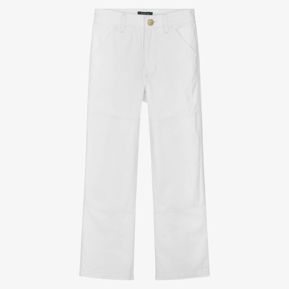 Off-white jeans for girls by Ralph Lauren, made in soft denim. With classic five pocket styling and contrast ivory stitching, these cool jeans have large panels on the front of the legs and a carpenter-style pocket on the back. The front pockets have distressed edges and there is a vintage-style logo patch on one of the back pockets. They fasten with a button and zip and have a useful adjustable waist for a great fit.