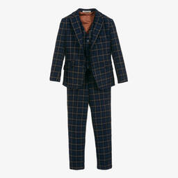 A smart bright blue Romano suit, with white pinstripes. It is made in a soft viscose blend and beautifully tailored. The jacket has a copper-coloured silky lining, patterned in navy blue jacquard dots to match the back of the waistcoat, with useful internal pockets. The coordinating trousers fasten with a button, zip, hook and eye.