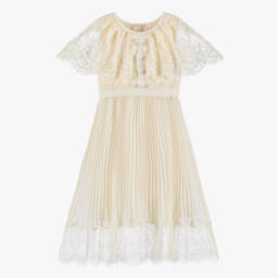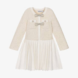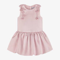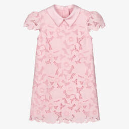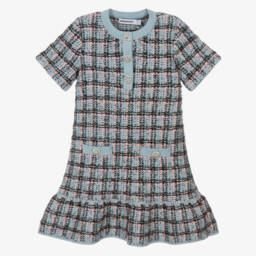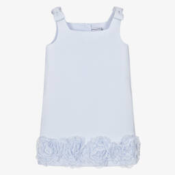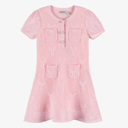 A blue washed denim dress for girls by Self-Portrait, with an eye-catching, all-over bow pattern. Made in lightweight cotton, it has decorative pearl, diamanté and gold filigree buttons on the front pockets, with a fluted, ruffled hemline for added style.