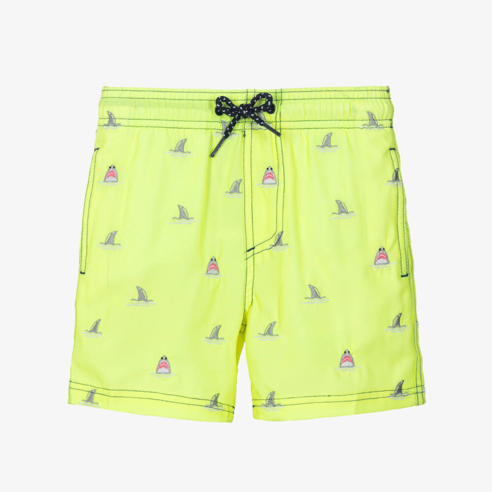 Boys neon yellow swim shorts by Shade Critters, made in soft, lightweight fabric with UPF 50+. Embroidered with grey sharks, these fun shorts reveal a contrasting shark pattern when wet. They have a comfortable mesh lining and an elasticated drawstring waist to adjust the fit. They have two side pockets and an additional velcro pocket on the back.