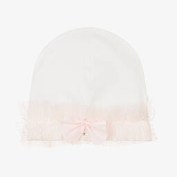 Baby girls peach pink floral print hat from Sofija. The outer fabric is made in soft cotton jersey and the lining is warm and fleecy. There are ear flaps and chin ties to secure, with a cute bow on the top.