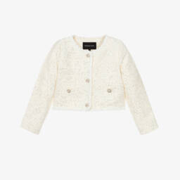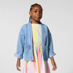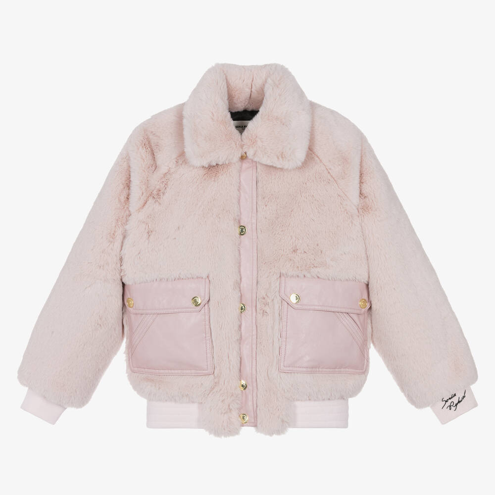 Gorgeous pink faux fur jacket for girls by Sonia Rykiel Paris. Beautifully soft and fluffy, it has a stylish collared blouson design with comfortable ribbing on the cuffs and hem. Lined in black satin with a jacquard logo pattern, it fastens with branded poppers on a faux leather placket which matches the front patch pockets. There is an embroidered script logo on one sleeve for a discreet designer finishing touch.