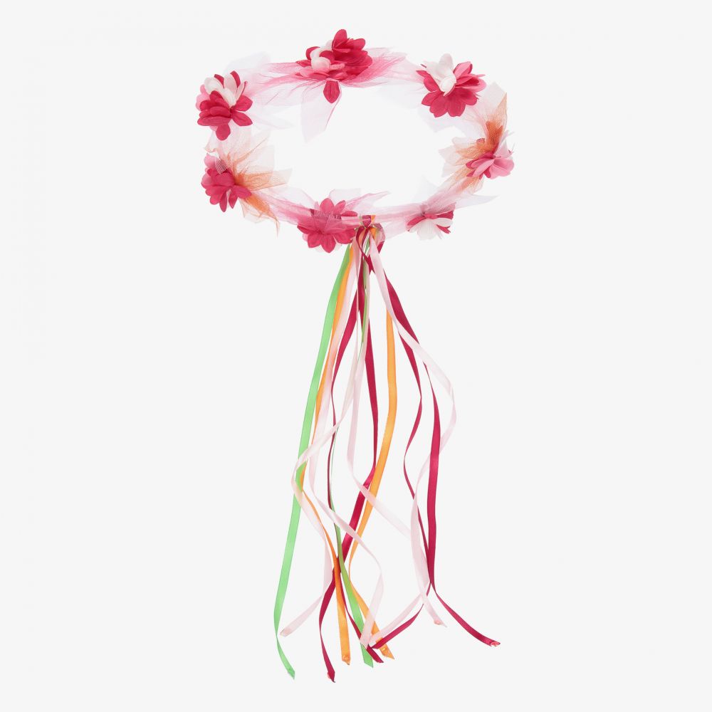 Girls pink headband by Souza, with a flexible pink satin-covered band. Ideal for use with a fairy costume, it has tonal pink tulle and satin flower appliqués and colourful long ribbons hanging from the back.