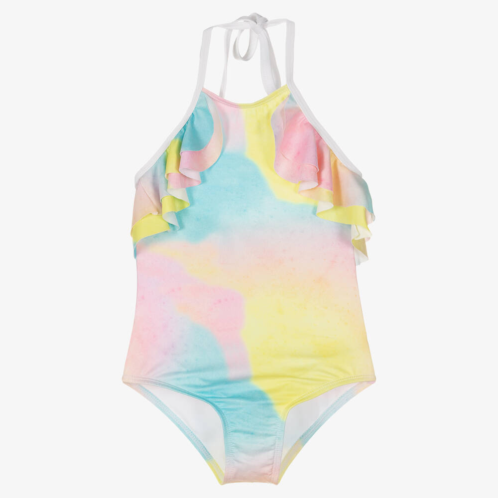 In pretty pastel colours, this tie-dye print swimsuit for girls is by Stella Cove. Trimmed with feminine ruffles, it has a halter neck strap that ties behind the neck. Silky soft and stretchy, this stylish one piece is fully lined for comfort.