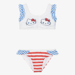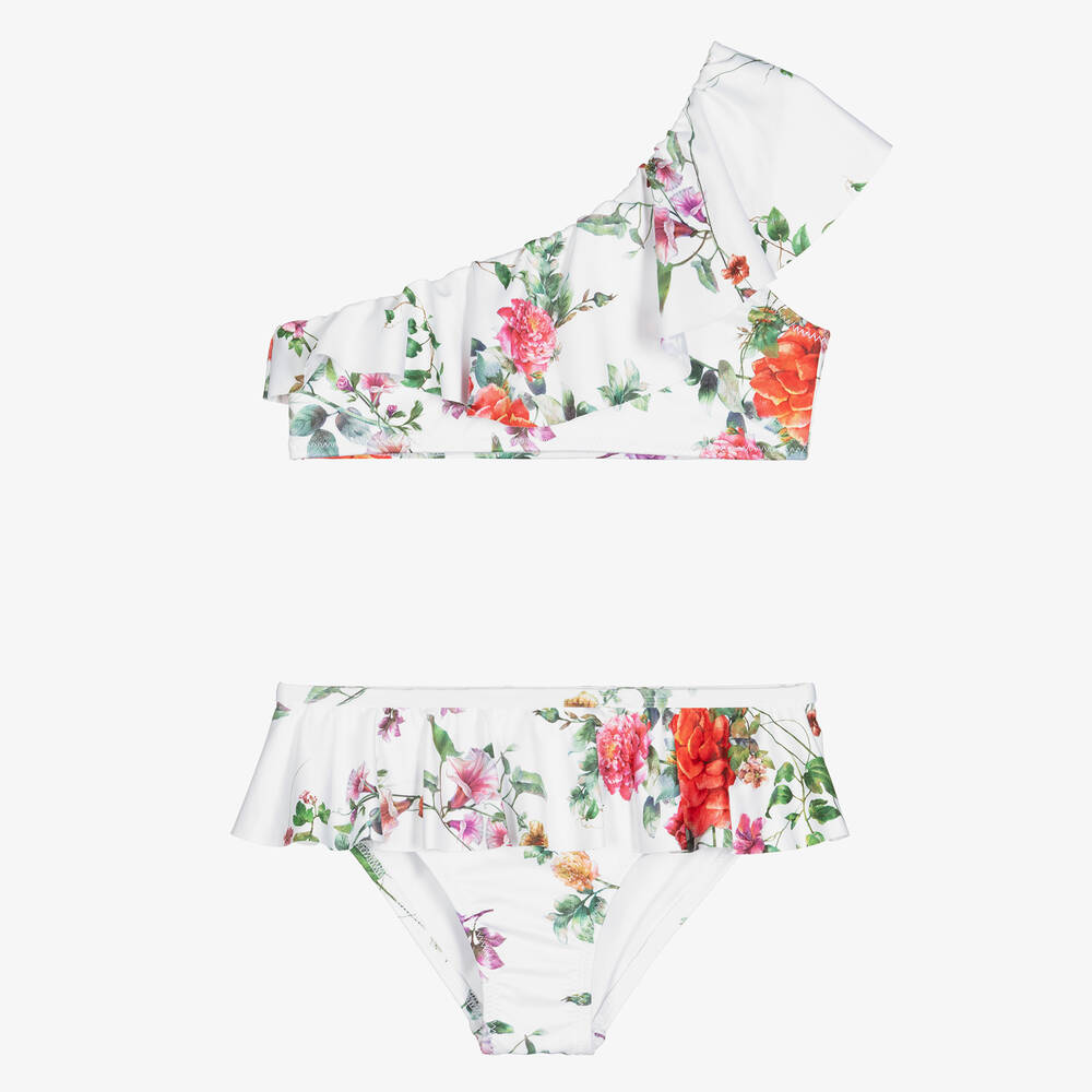 Lovely white bikini for girls by American brand Stella Cove, with a pink and green garden flower print. Soft, silky and fully lined for comfort, both the top and bottoms have a pretty ruffle. The top has one shoulder strap.