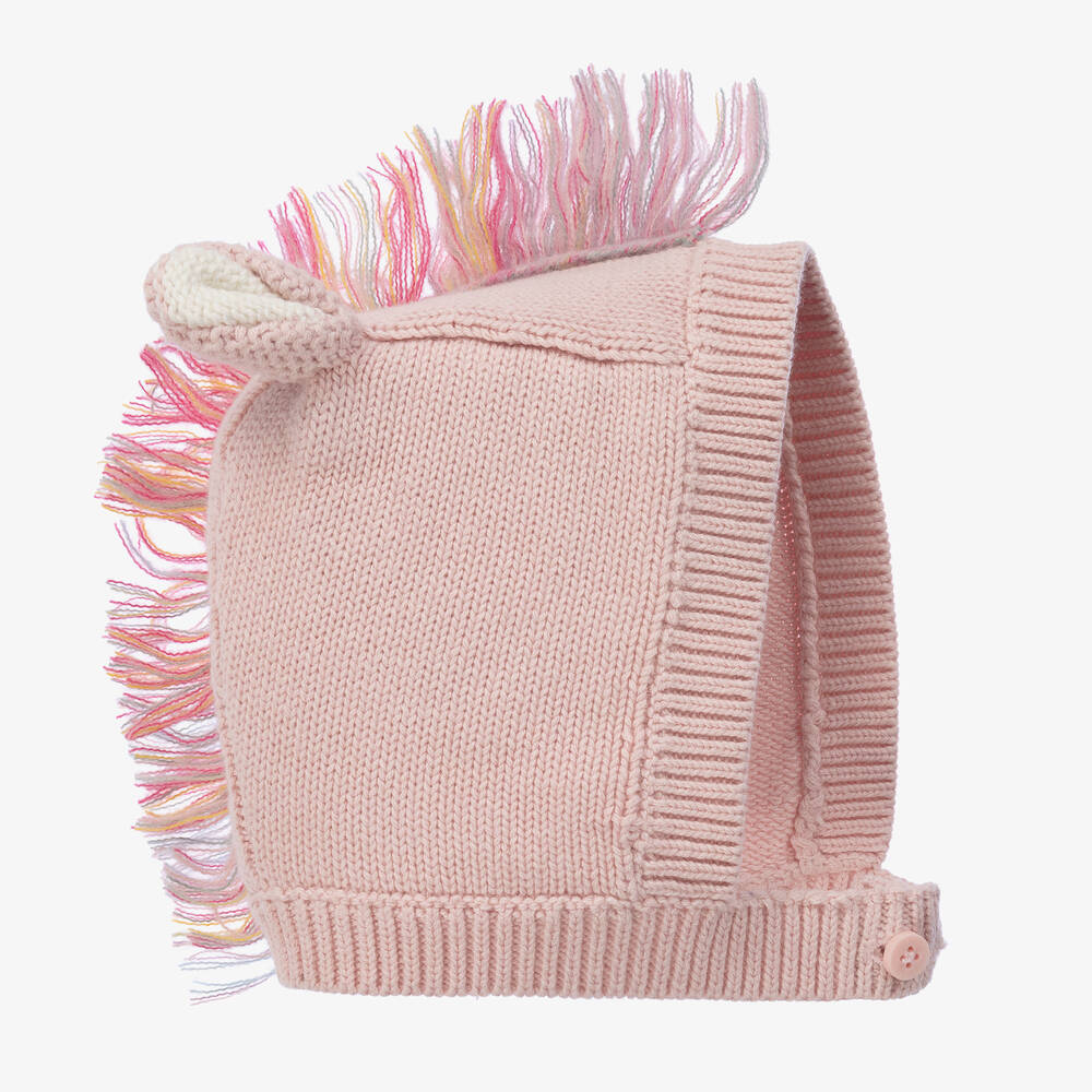Cute for baby girls, this pink Stella McCartney Kids bonnet is knitted in soft organic cotton. Part of the British designer's unicorn collection, it has colourful fringing detail and 3D ears on the top, and fastens with a button under the chin. The Stella McCartney fit can be quite small so choose a size up if you want room to grow.