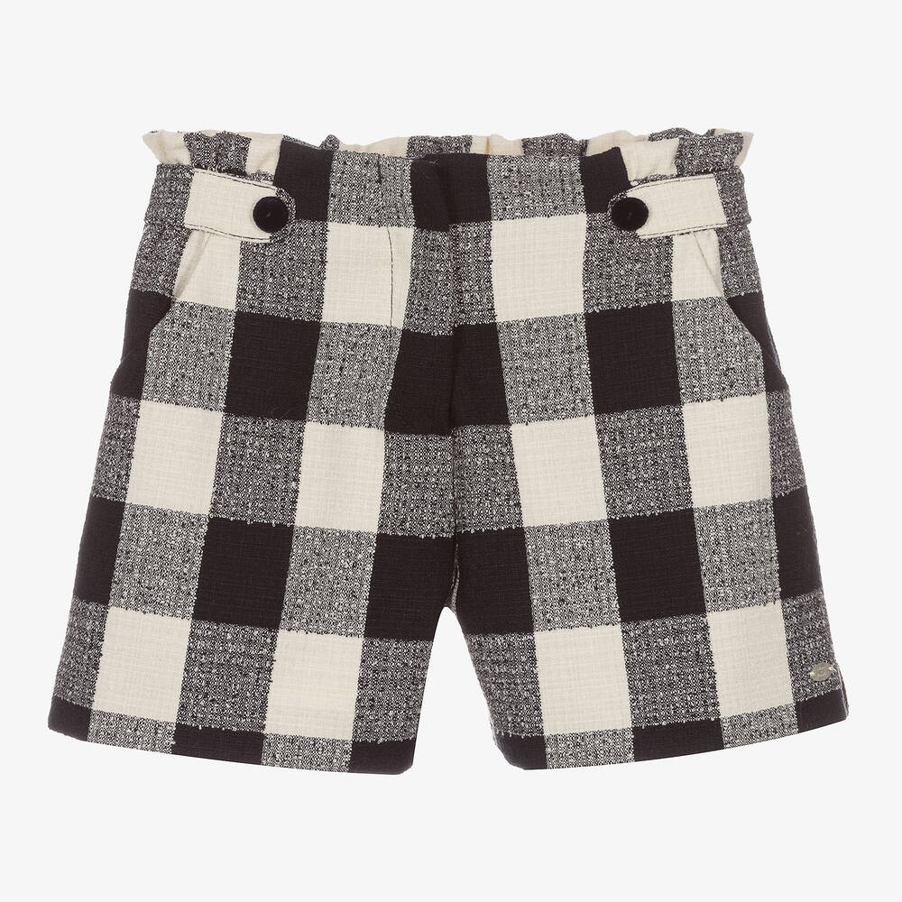 Stylish dark navy blue and ivory check shorts for girls by Tartine et Chocolat, made in woven polyester. They have a cool paper bag waist and blue velvet faux buttons on the front. Lined with silky satin, there are slanted front pockets, an adjustable waist and a button and zip fastening on the front.