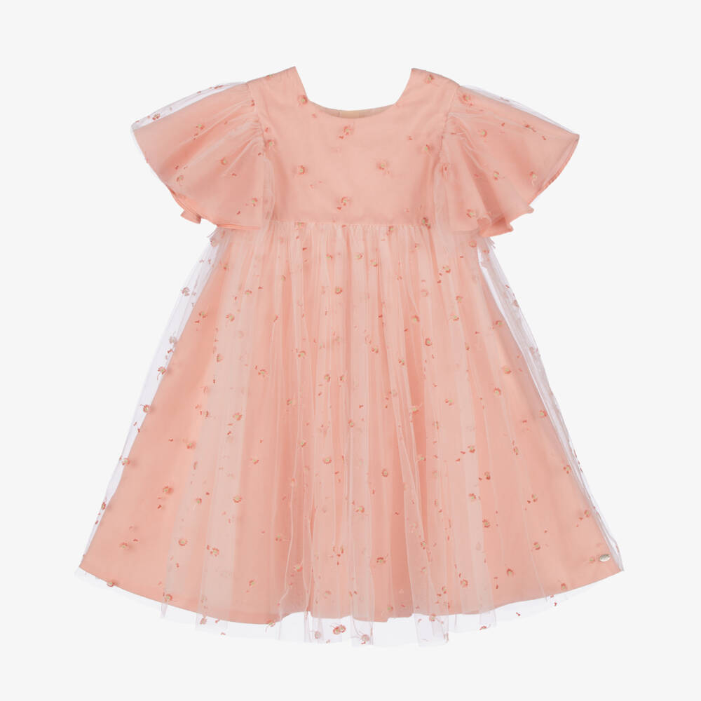 A gorgeous pink special occasion dress for girls by Tartine et Chocolat, made in soft cotton sateen with an embroidered tulle overlay. Designed with pretty flutter sleeves and a stylish V-shaped back, this lovely dress has a comfortable cotton lining and fastens neatly on the back with a concealed zip.