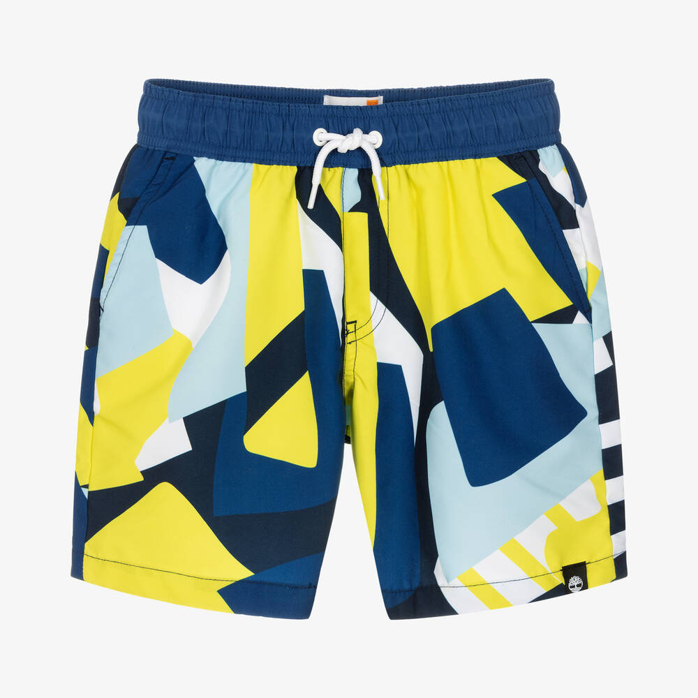 Cool abstract swim shorts for teen boys by Timberland, in shades of blue, white and lime green. Both stylish and practical, they have a signature logo patch on the hem and slanted pockets on the hips. Lined in breathable mesh, these smooth and lightweight bottoms are finished with a drawstring waist for an adjustable fit.