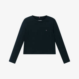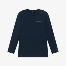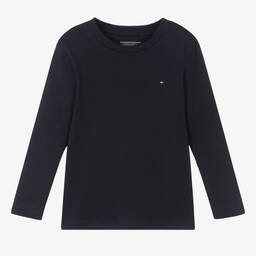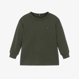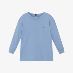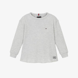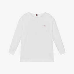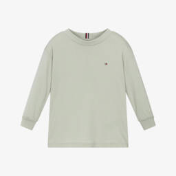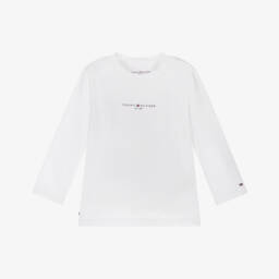 A beige long-sleeved cotton T-shirt for baby boys and girls by Tommy Hilfiger. Casual and comfortable for everyday, it features a white logo print with the iconic signature flag embroidery from the 1985 Collection, and branded shoulder poppers.