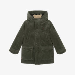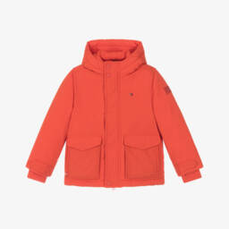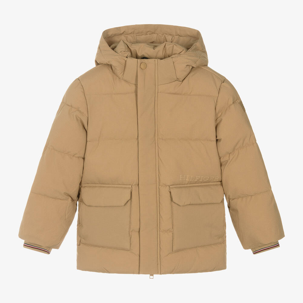 Sandy beige puffer jacket for boys by Tommy Hilfiger, made in smooth, coated ripstop fabric. Warmly padded and showerproof, this cosy jacket has a removable hood and ribbed cuffs for extra protection from the elements. There are popper fastening flap pockets on the front with additional patch pockets underneath and a tonal logo above. It fastens with a concealed zip and poppers and has subtle branded details on the sleeve, hood and cuffs for a statement finish. This product contains at least 50% recycled fibres.