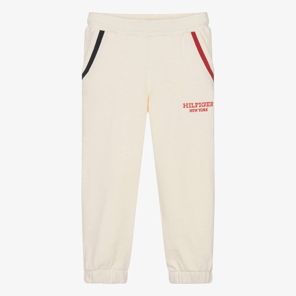 Sporty, ivory joggers for girls by American designer, Tommy Hilfiger, made in soft, mid-weight cotton jersey. Casual and comfortable, they have slanted pockets on the front, detailed with the brand's signature colours and an elasticated waistband with an inner drawstring to ensure a comfortable fit. An embroidered logo on the front and the iconic flag logo on the back, complete the designer look.