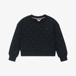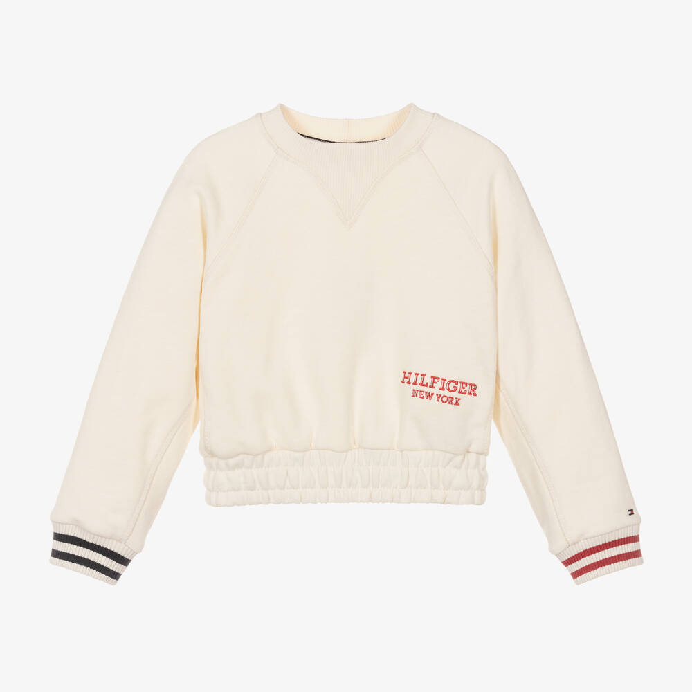 An ivory long-sleeved sweatshirt for girls by Tommy Hilfiger, made from soft, mid-weight cotton jersey. Casually styled, it has a lightly ribbed neckline, with signature stripes on the cuffs and an elasticated hem that sits comfortably on the waist. The brand's logo is appliquéd on the front, with the iconic flag motif on one sleeve to complete the designer look.