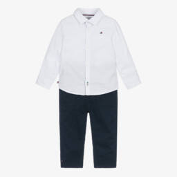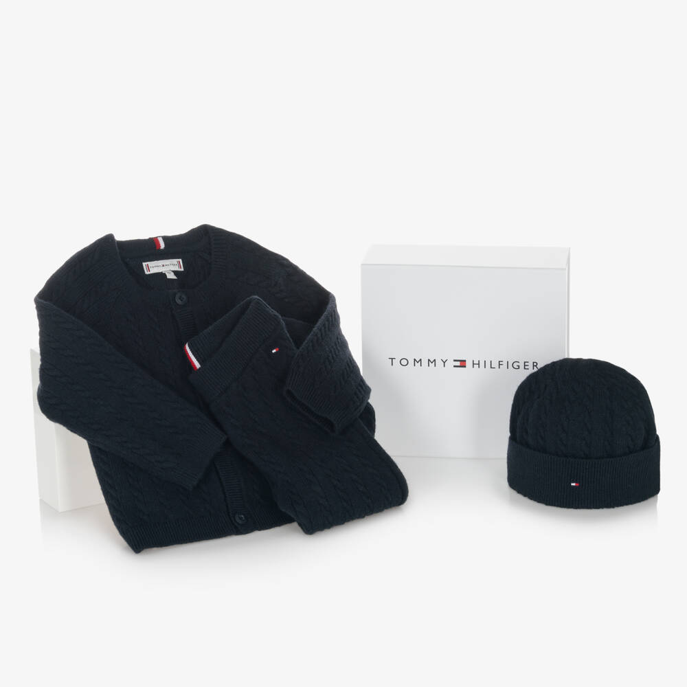 A lovely cable-knit navy blue trouser set for baby boys and girls by Tommy Hilfiger, presented in a branded gift box. Cosy and comfortable, it is knitted in a beautifully soft cotton and wool blend. The cardigan has button fastenings, the trousers have a gently elasticated waist, and the hat has a sweet turned up brim. Flag logo embroidery and tricolour striped trims add a signature finish.