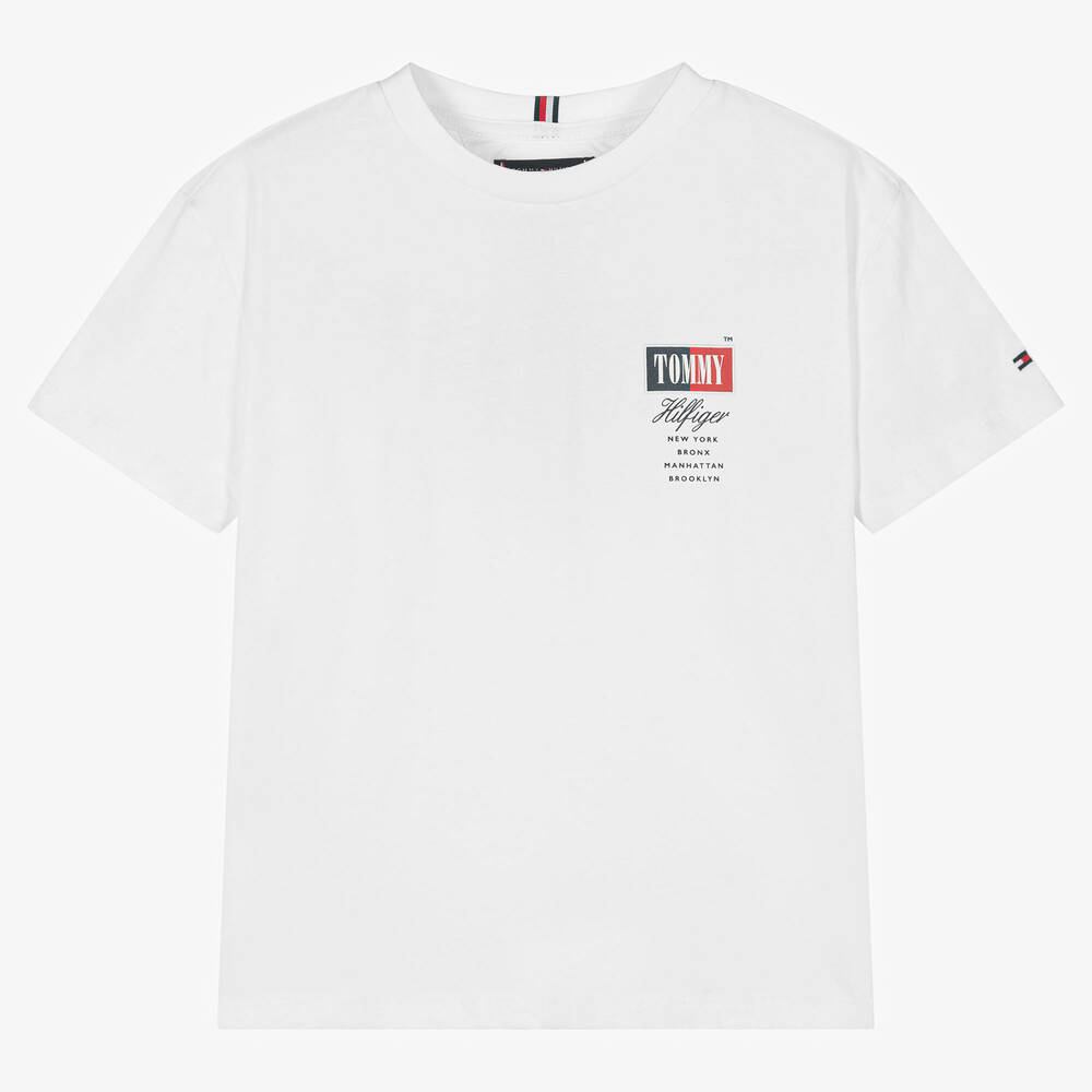 Classic white T-shirt for teen boys by Tommy Hilfiger, made in soft and stretchy cotton jersey. Cool rubberised flag logos decorate the front and back in the designer's signature tricolour palette. A further flag logo is embroidered on one sleeve and signature stripe detailing can be seen on the back of the neck. This garment is made with at least 50% transitional cotton.