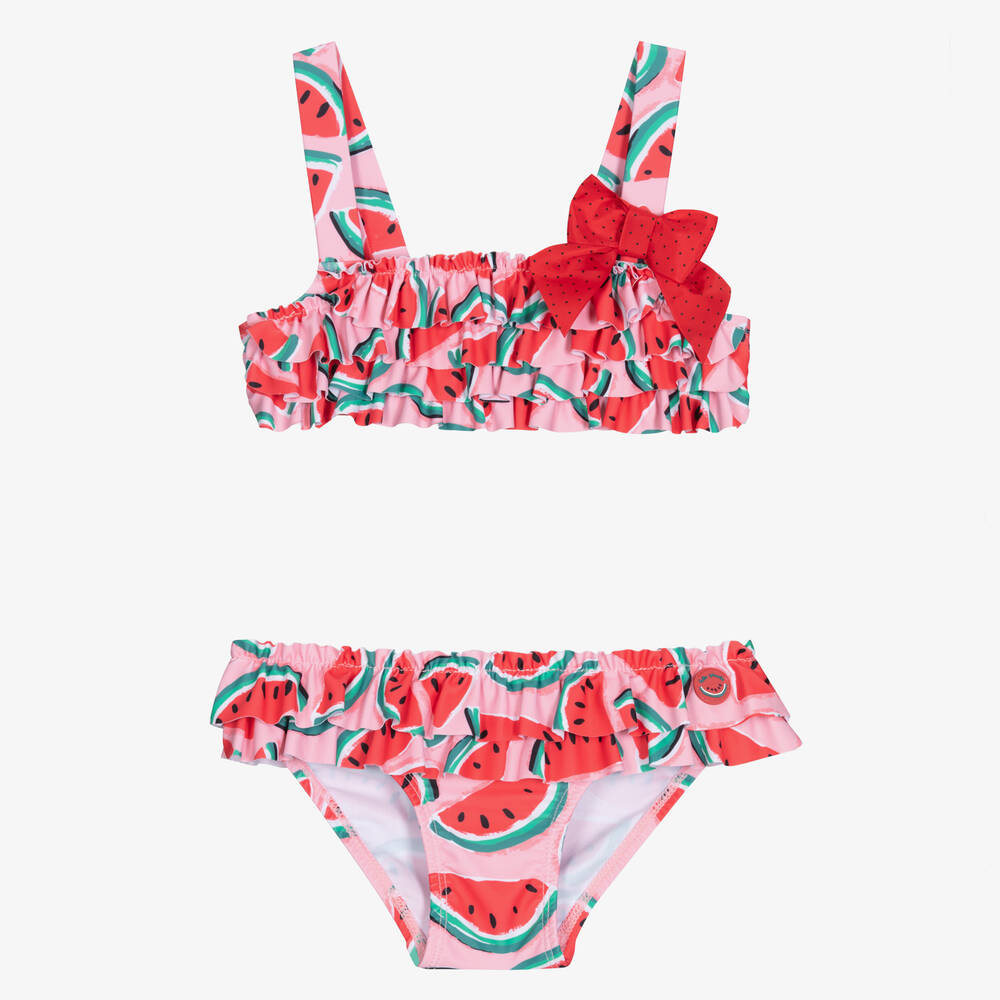 Adorable pink bikini for girls, patterned in an all-over watermelon print, by Spanish brand Tutto Piccolo. The top has layered ruffles and a polka dot bow appliqué. The matching bottoms have a breathable mesh lining and a rubberised logo on the front.