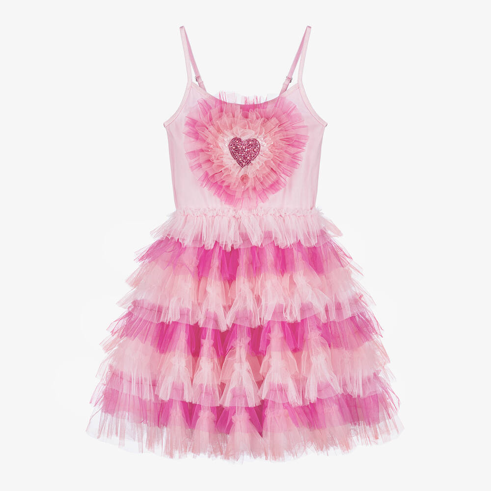 A pretty pink dress for girls from Tutu du Monde, in collaboration with Flour Shop by Amirah Kassem. The soft cotton jersey is layered with alternating tones of pink tulle for a striking skirt and has an embellished heart on the chest for a touch of sparkle.
