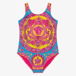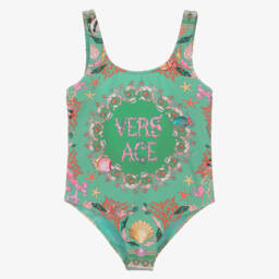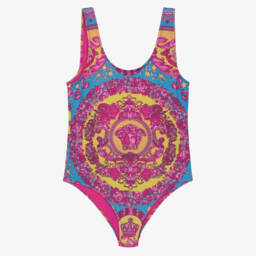 Bringing designer style to the beach or poolside, this baby girls swimsuit is inspired by the adult collection of luxury brand Versace. Soft, silky and fully lined, with a bold black logo, it has a red floral pattern on a white background, incorporating scattered strawberries and ladybirds. Bows on the hips and adjustable, cross-over straps complete the look.